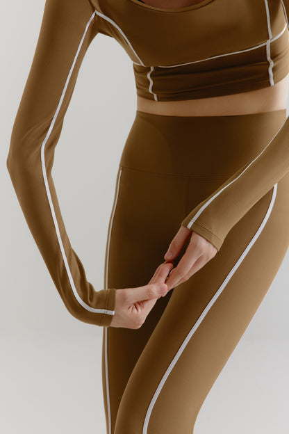 The stitching and fit are divine. I was psyched that the sleeves were long enough (i'm 6 ft tall). The material is the mousse fabric –– which is now the only workout material I buy. It's incredible soft, but durable and hugs your skin just right. it also is AMAZING at wicking away sweat during hot yoga sessions. This is my new favorite statement piece to wear to workouts – it fit so much better than I was expecting!